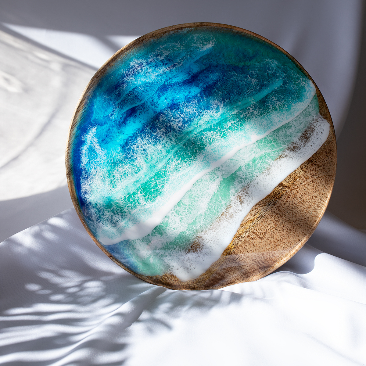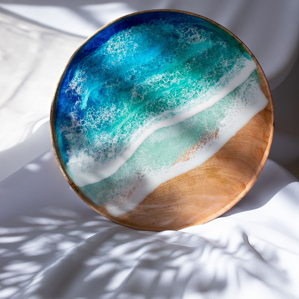 Taca malowana żywica epoksydową techniką warstwową Ø37 cm, na drewnie