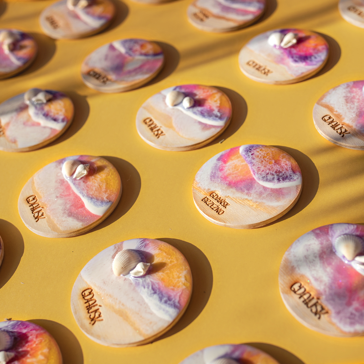 Każdy magnes maluję 2 warstwami żywicy epoksydowej na drewnianej sklejce,
