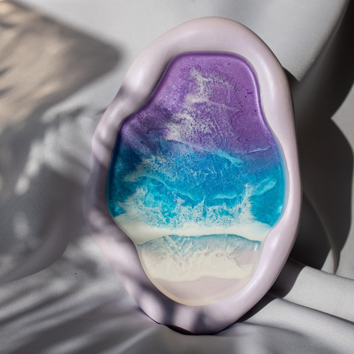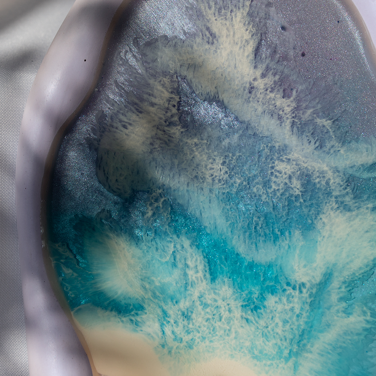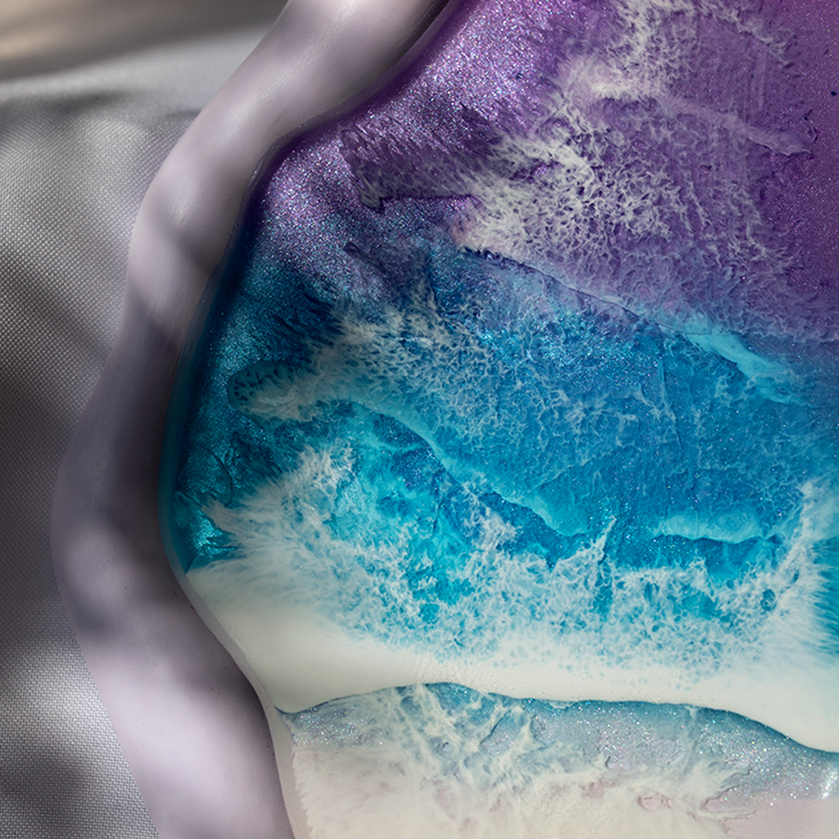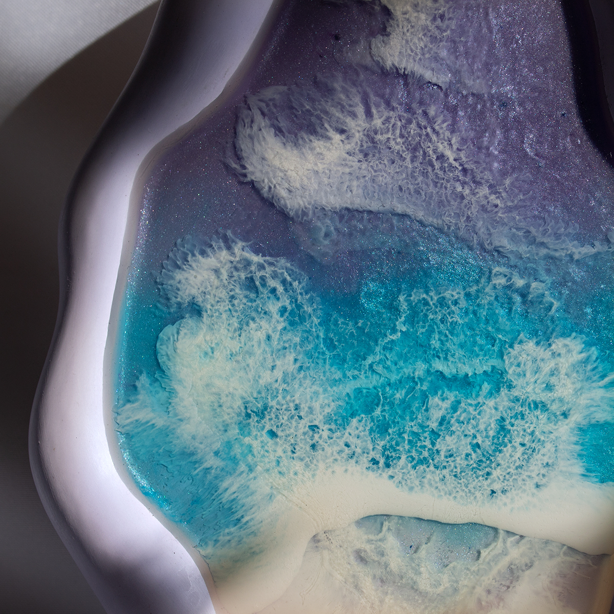 Spód wykonuję z gipsu polimerowego, szlofuję go, oznaczam, lakieruje, a potem maluje na nim kilka warstw żywicą epoksydową – intuicyjnie, zgodnie z tym, co podpowiada mi kolor i kompozycja.