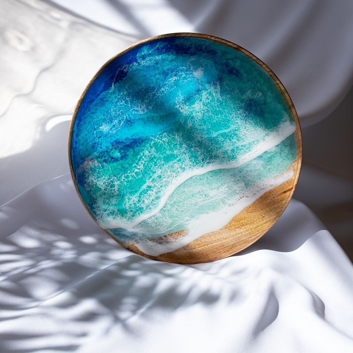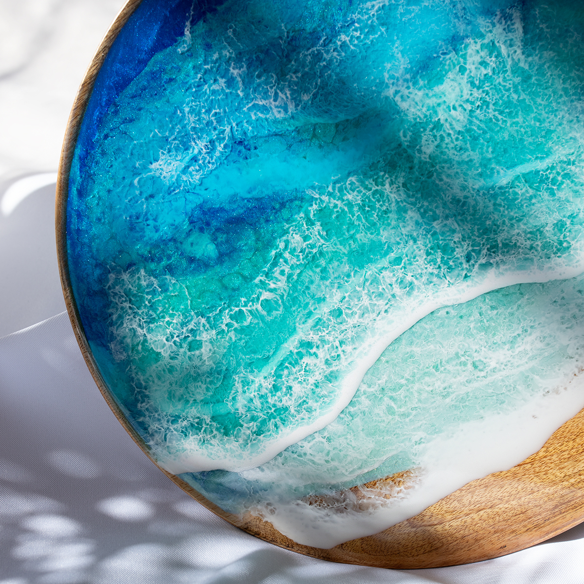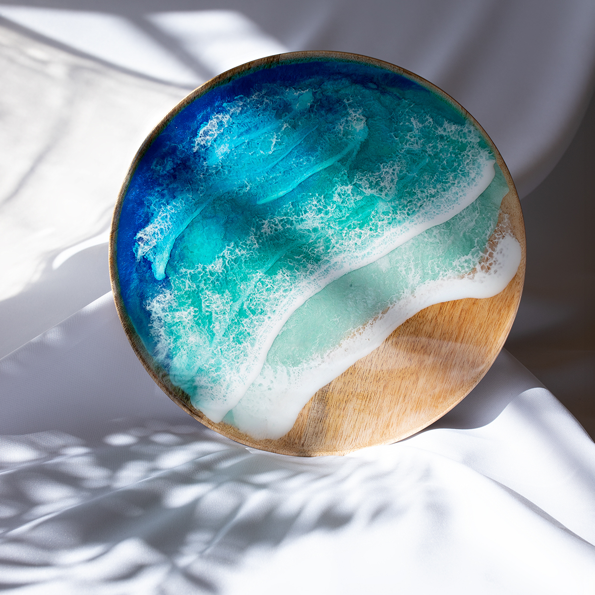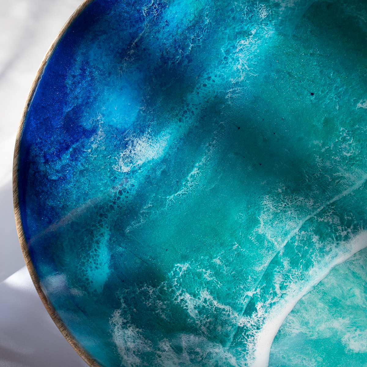 Drewniany spód tacy malowany jest kilkoma warstwami żywicy epoksydowej – intuicyjnie, zgodnie z tym, co podpowiada mi kolor i kompozycja.