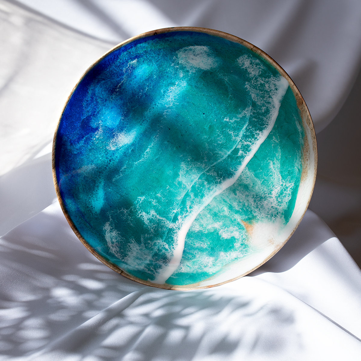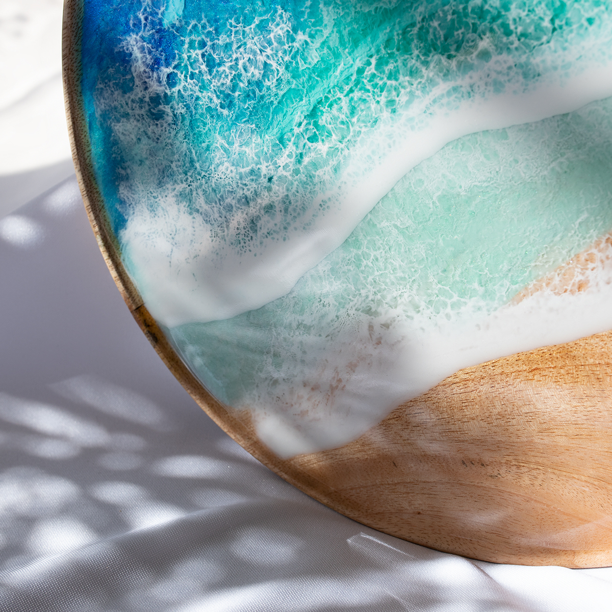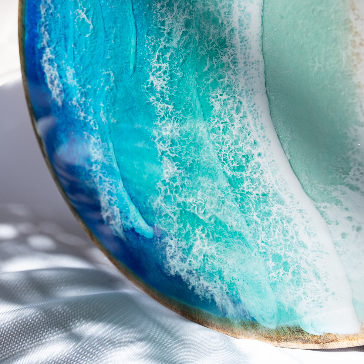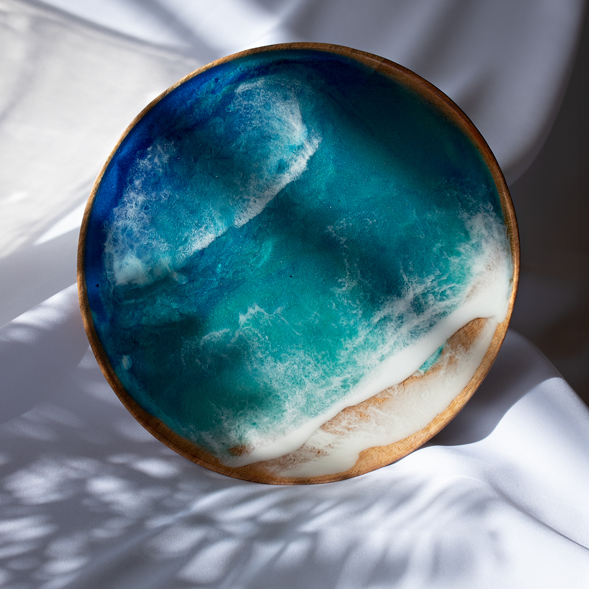 Drewniany spód tacy malowany jest kilkoma warstwami żywicy epoksydowej – intuicyjnie, zgodnie z tym, co podpowiada mi kolor i kompozycja.
