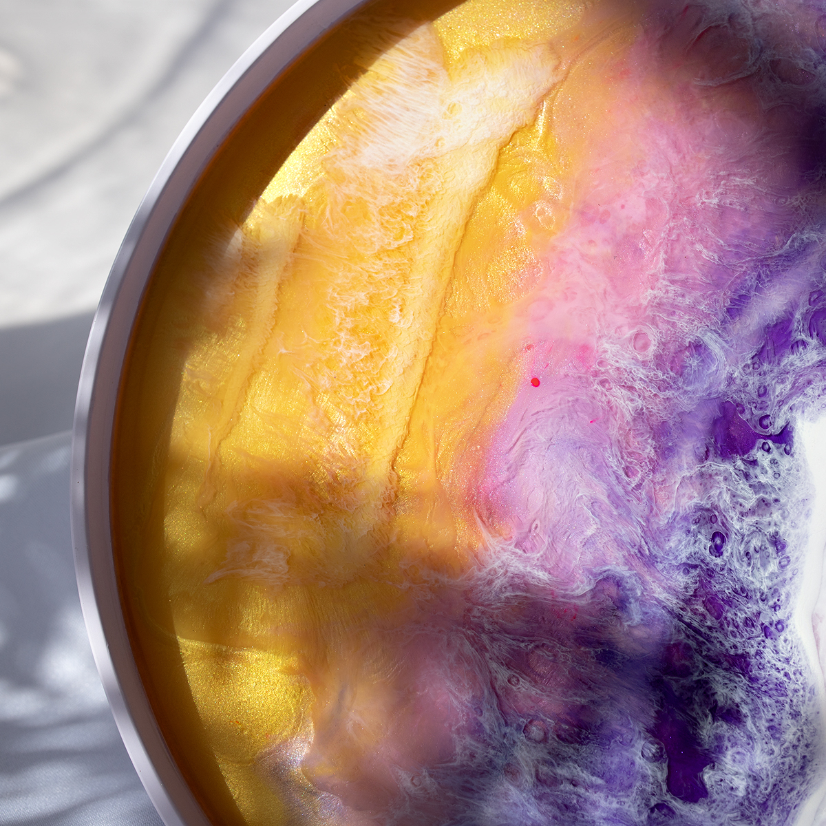 Spód wykonuję z gipsu polimerowego, szlifuję go, oznaczam, lakieruje, a potem maluje na nim kilka warstw żywicą epoksydową – intuicyjnie, zgodnie z tym, co podpowiada mi kolor i kompozycja.