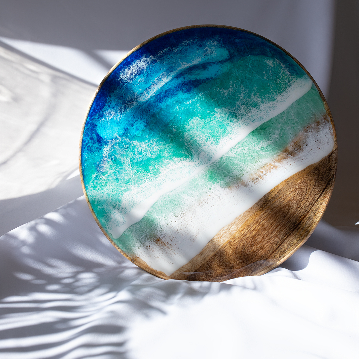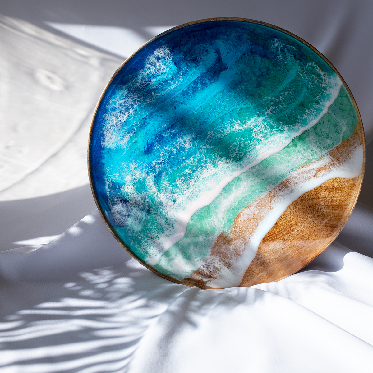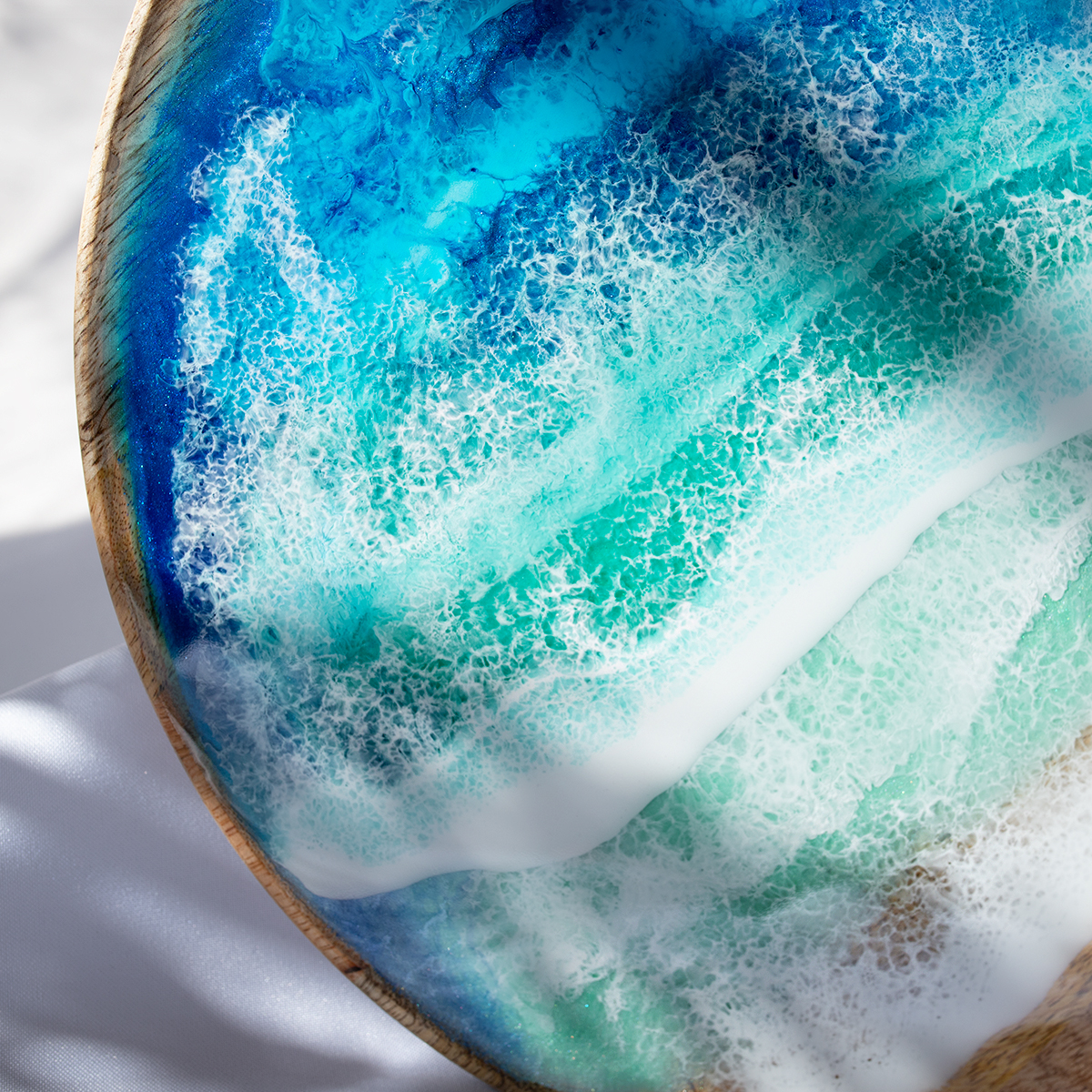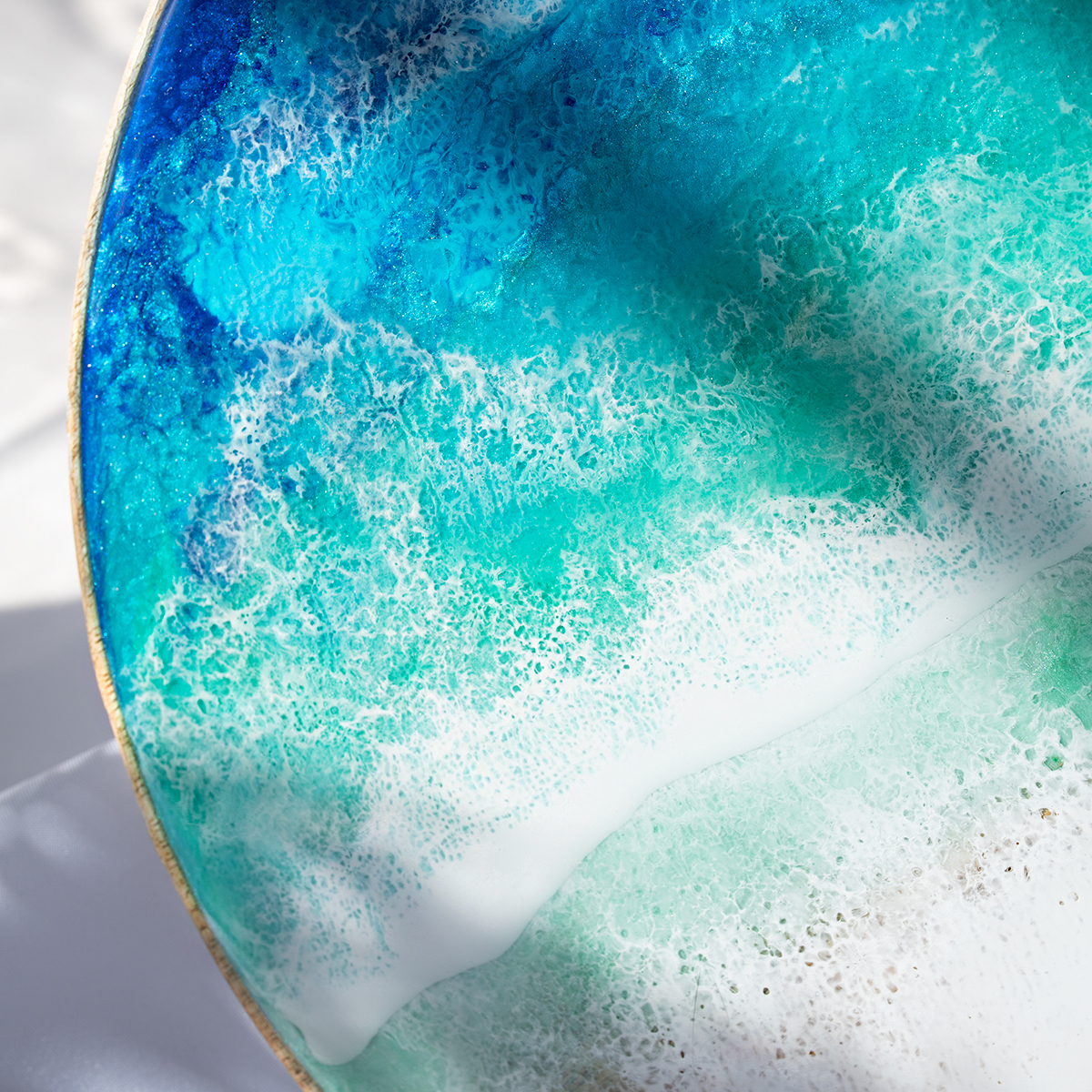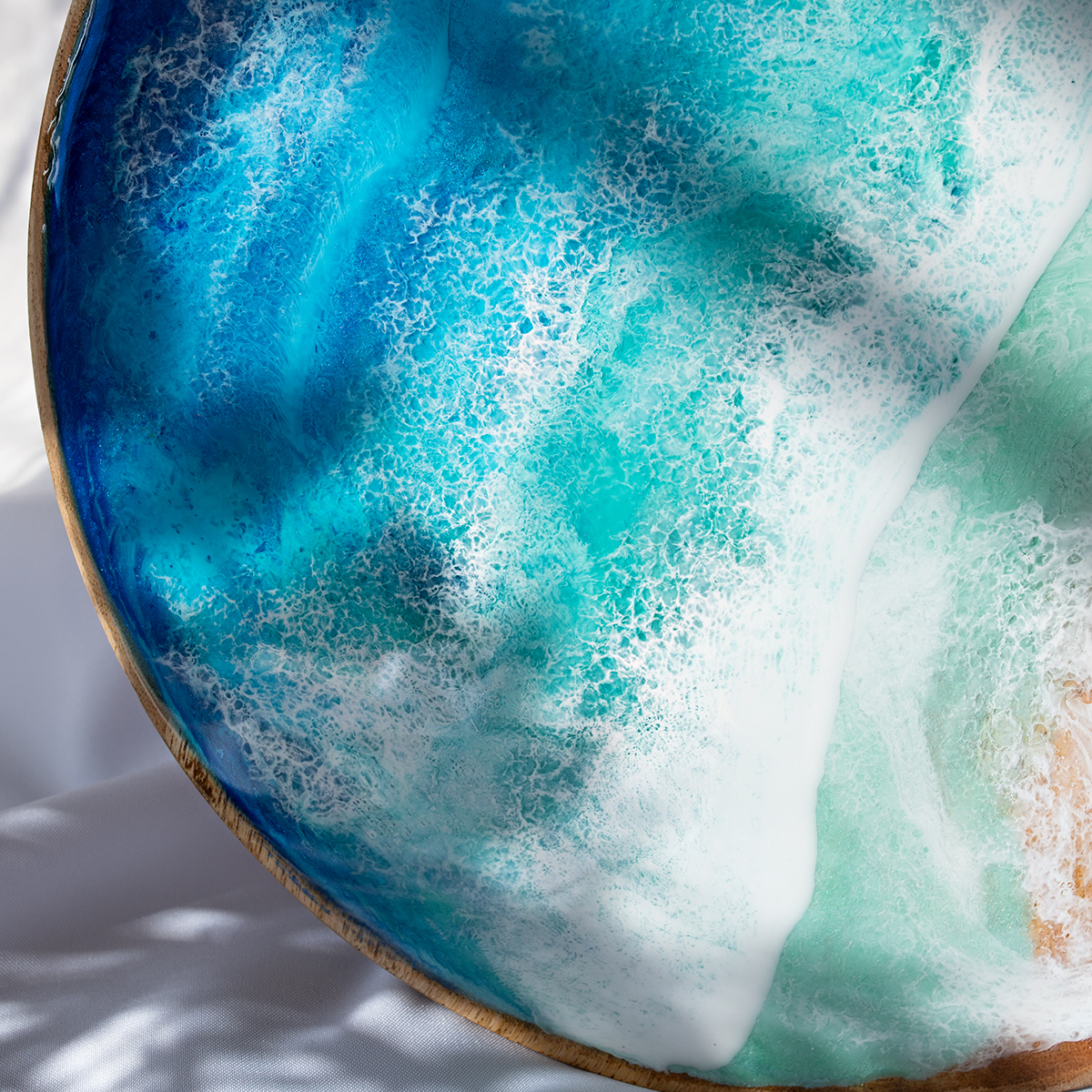 Drewniany spód tacy malowany jest kilkoma warstwami żywicy epoksydowej – intuicyjnie, zgodnie z tym, co podpowiada mi kolor i kompozycja.